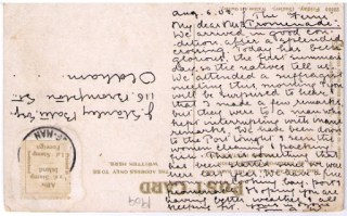 My most treasured card is definitely this one below, with it’s fantastic message in tiny fountain pen script. Sent from the Isle of Man to an address in Oldham, and dated 6 August 1909, it reads: